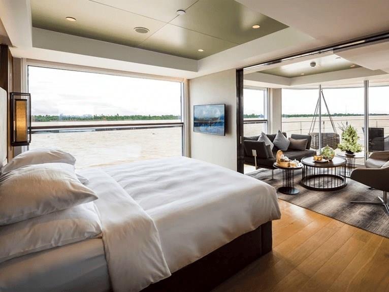 Scenic’s Mekong River cruises take place aboard Scenic Spirit, a 279-foot vessel that can accommodate 68 passengers in 34 one-bedroom balcony suites. The Scenic Spirit offers an almost 1:1 staff-to-guest ratio and is equipped with a sleek swimming pool, a steam sauna, and an open-air cinema.
